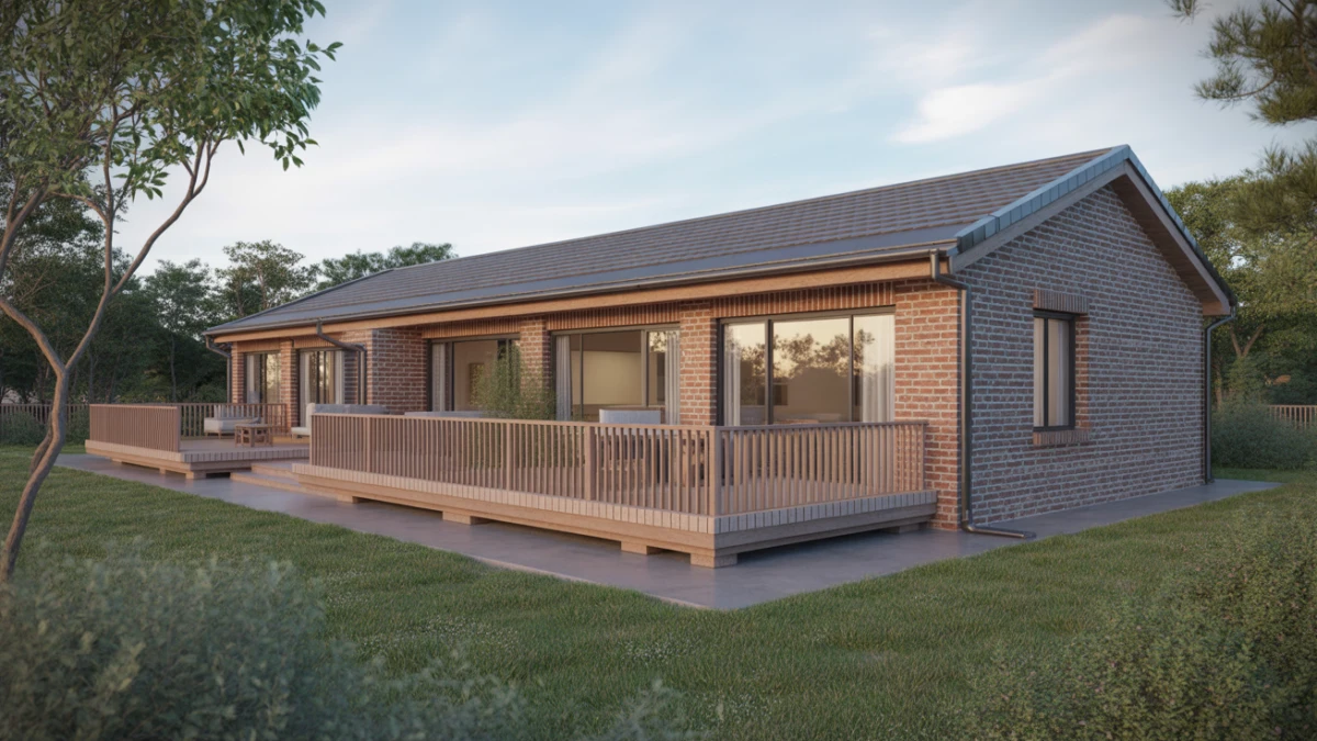 Одноэтажный кирпичный дом площадью 90 квадратных метров представляет собой оптимальное решение для небольшой семьи из 2-3 человек. Проект предусматривает компактную, но функциональную планировку с открытой террасой.